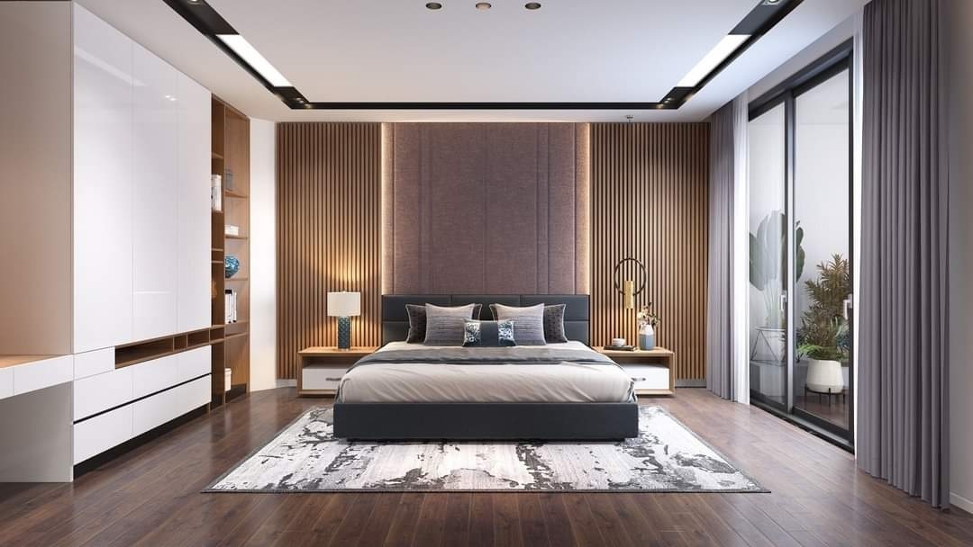 Bố trí đồ nội thất và sự kết hợp nhiều công năng trong phòng thể hiện sự tinh tế, đồng thời giúp không gian của phòng ngủ trở nên gọn gàng và tiện nghi hơn. Mẫu này khá rộng, nội thất tối giản, giường ngủ được bố trí trung tâm, tủ quần áo được thiết kế khá chỉn chu cạn tường, tủ được sử dụng tông màu trắng, phân nhiều ngăn nhỏ. Bạn sẽ có thêm nhiều không gian để bố trí quần áo, phụ kiện theo ý thích. Sàn được thiết kế nội thất gỗ, xung quanh tường được thiết kế thảm trải sàn, ban công được thiết kế có view cây xanh giúp cho không gian trở nên mát hơn.