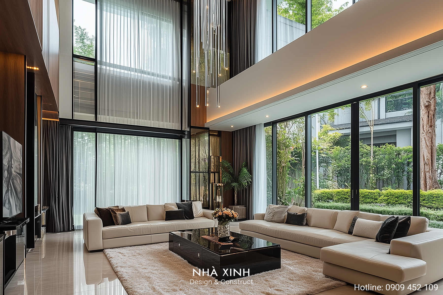 Thiết kế nội thất phòng khách cần bộ sofa chất lượng, bàn trà, kệ TV, đèn chùm hoặc đèn thả.