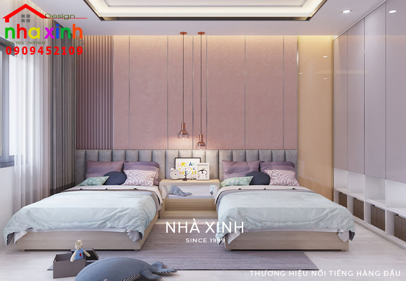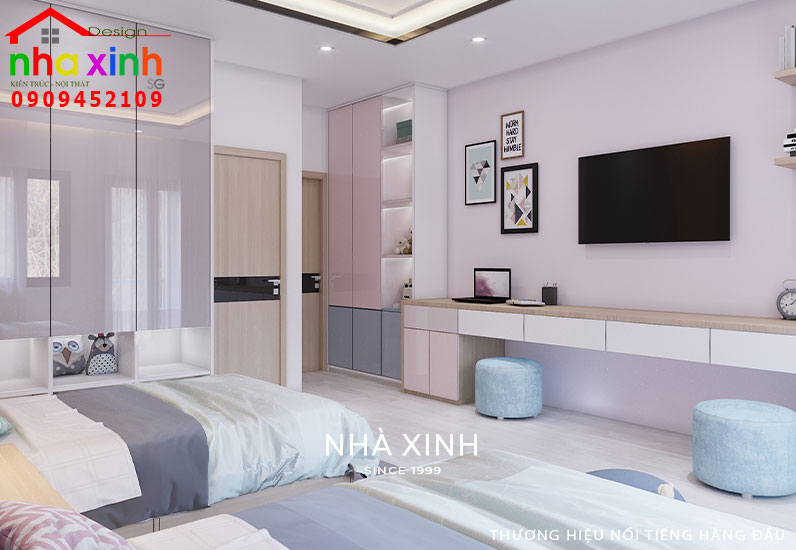 Phòng ngủ với các bố trí nội thất tiện nghiGia đình Ông Hùng có 2 cô bé dễ thương trạc tuổi nhau, thế nào gia chủ mong muốn có không gian sống thoải mái cho 2 bé. Không gian phòng ngủ tươi đối rộng nên Kiến Trúc Sư Nhà Xinh có ý tưởng thiết kế giường ngủ đôi, tông màu chủ đạo là gam màu hồng nhẹ, bàn làm việc học tập tích hợp trên khung kệ tủ tivi, bàn phân chia nhiều ngăn tủ, tường bố trí vài bức tranh xinh xắn, sàn lát gạch.
